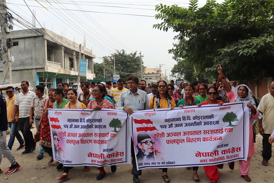 विराटनगर स्थित कोशी अञ्चल अस्पतालको सरसफाई गर्नुका साथै अस्पतालका सवै विरामीलाई फलफुल वितरण गरेको छ। नेपाली कांग्रेस मोरडका सभापति डिगवहादुर लिम्वुले बीपीको योगदान र उनका भनाइलाई कांग्रेसले आत्मसाथ गर्दै अगाडी बढ्नु पर्ने बताए । नेपाली कांग्रेस नगरका सभापति तथा विराटनगर महानगरका मेयर भीम पराजुलीले बीपीको विचार आजपनि उत्तिकै सान्दर्भिक रहेको भन्दै यसमा सवै कांग्रेसीजन गोलवद्ध भएर हिड्न आबश्यक रहेको औल्याए । उनले विराटनगरको विकासमा सवैको खवरदारी र सुझाव आबश्यक रहेको बताए ।