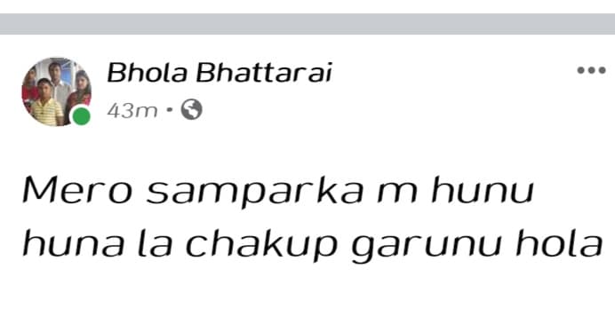 उनलाई आज संक्रमण देखिएको उनलाई आवर विराटनगरलाई जानकारी दिए साथै उनले आफ्नो सामाजिक संजालमा समेत उनको नजिकमा रहेकालाई कोरोना संक्रमण जाच गराउन अनुरोध गरेका छन् ।
