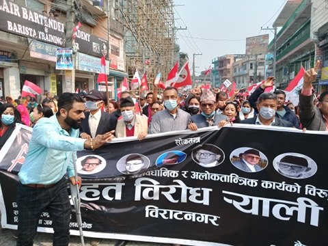 यस्तै कार्यक्रमलाई सम्बोधन गर्नुहुँदै नेपाली कांग्रेसका केन्द्रिय सदस्य अमृत अर्यालले प्रतिगमन विरुद्ध कांग्रेस एक्लैले निर्णय गरि अघि बढ्नुपर्छ भन्ने पक्षमा रहेको जिकिर गर्नुभयो । प्रतिनिधिसभा विघटनविरुद्ध नेपाली कांग्रेसले भने पहिलो चरणमा देशको १ सय ६५ वटा प्रदेशसभा निर्वाचन क्षेत्र, दोश्रो चरणमा ३ सय ३० वटा प्रतिनिधिसभा निर्वाचन क्षेत्र, तेश्रो चरणमा पालिकास्तरीय र चौथो चरणमा वडास्तरीय विरोध प्रदर्शन तथा जनतालाई सु–सुचित गराउने कार्य गरिसकेको जनाएको छ ।