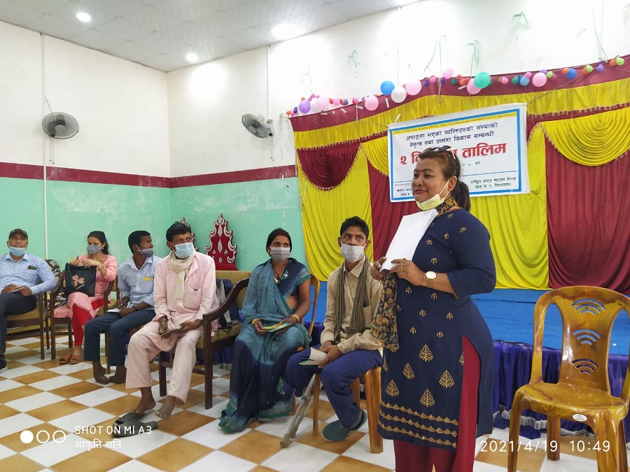 अपाङ्ग महासंघ प्रदेश नम्बर १ बिराटनगर र करुणा फाउन्डेसन इटहरीको संयुक्त आयोजनामा विराटनगर पान्चाली स्थित सगरमाथा पार्टि प्यालेसमा आयोजित कोभिड १९ पश्चातको उत्कृष्ट पुनरागमनको शुनिस्चितता:अपाङ्गता भएका व्यक्तिहरुको पहुच र दिगो विकासका लागि सबैको प्रतिबद्दता भन्ने मूल नाराका साथ अपाङ्गता भएका व्यक्तिहरुको संस्थाको नेतृत्व विकास सम्बन्धि दुई दिवसिय तालिम सम्पन्न भएको छ। उक्त तालिममा सुनसरी र मोरंगका विभिन्न पालिकाहरुबाट आफ्नो संस्थाको प्रतिनिधित्व गर्दै ६० जनाले उपथिती जनाएको आयोजक समितिले जानकारी दिएको छ।