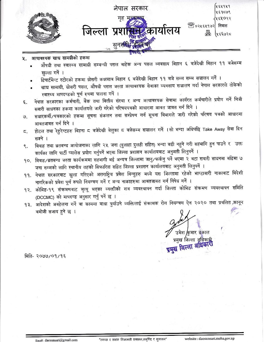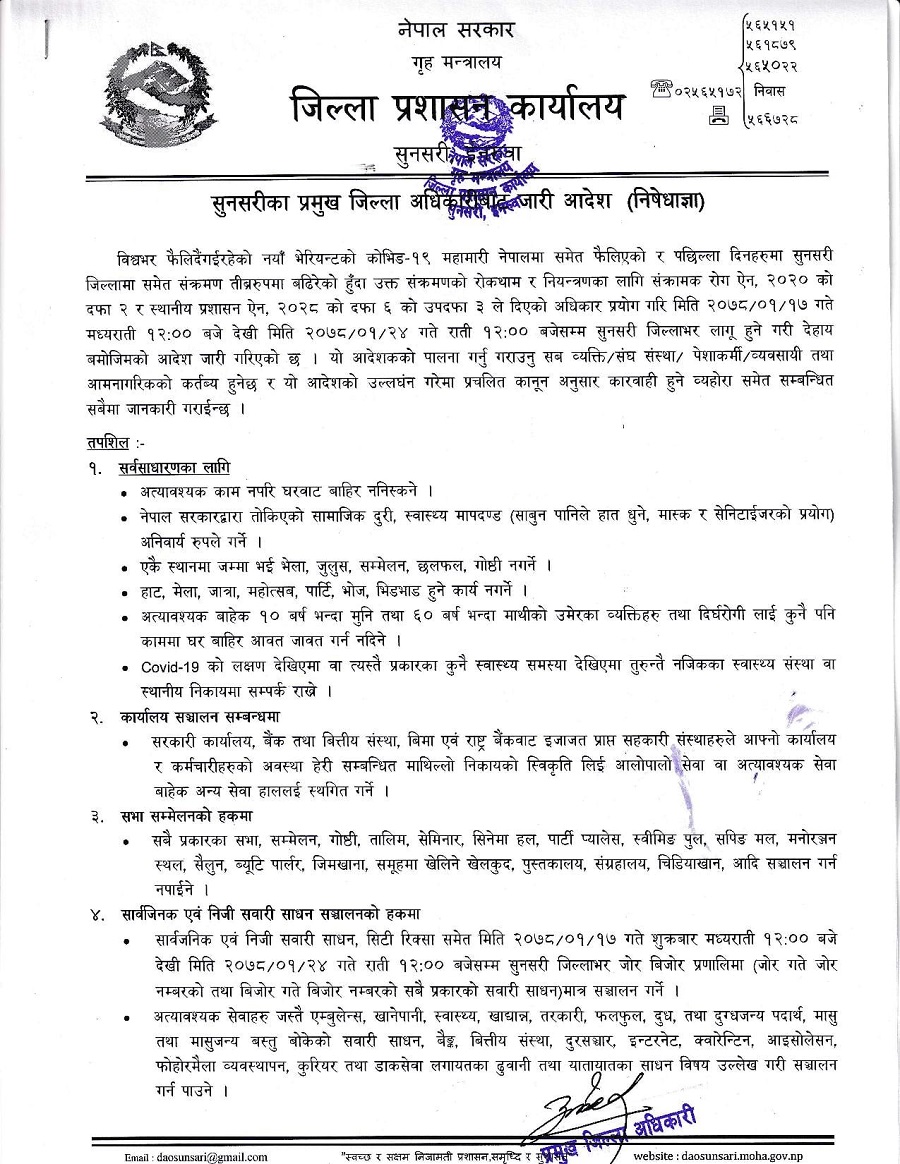 काेराेना माहामारीकाे बढ्दाे जाेखिमलाई मध्यनजर गर्दै सुनसरी प्रशासनले पनि निषेधाज्ञा जारी गर्ने भएकाे छ । सुनसरी जिल्ला प्रशासन कार्यालयकाे आज बसेकाे बैठकले सुनसरी क्षेत्रभित्र भाेलि शुक्रबार मध्य रातीदेखि बैशाख २४ गते रातिसम्म निषेधाज्ञा जारी गर्ने निर्णय गरेकाे कार्यालयका सूचना अधिकारी महेश कुमार पाेख्रेलले जानकारी दिएका छन् ।