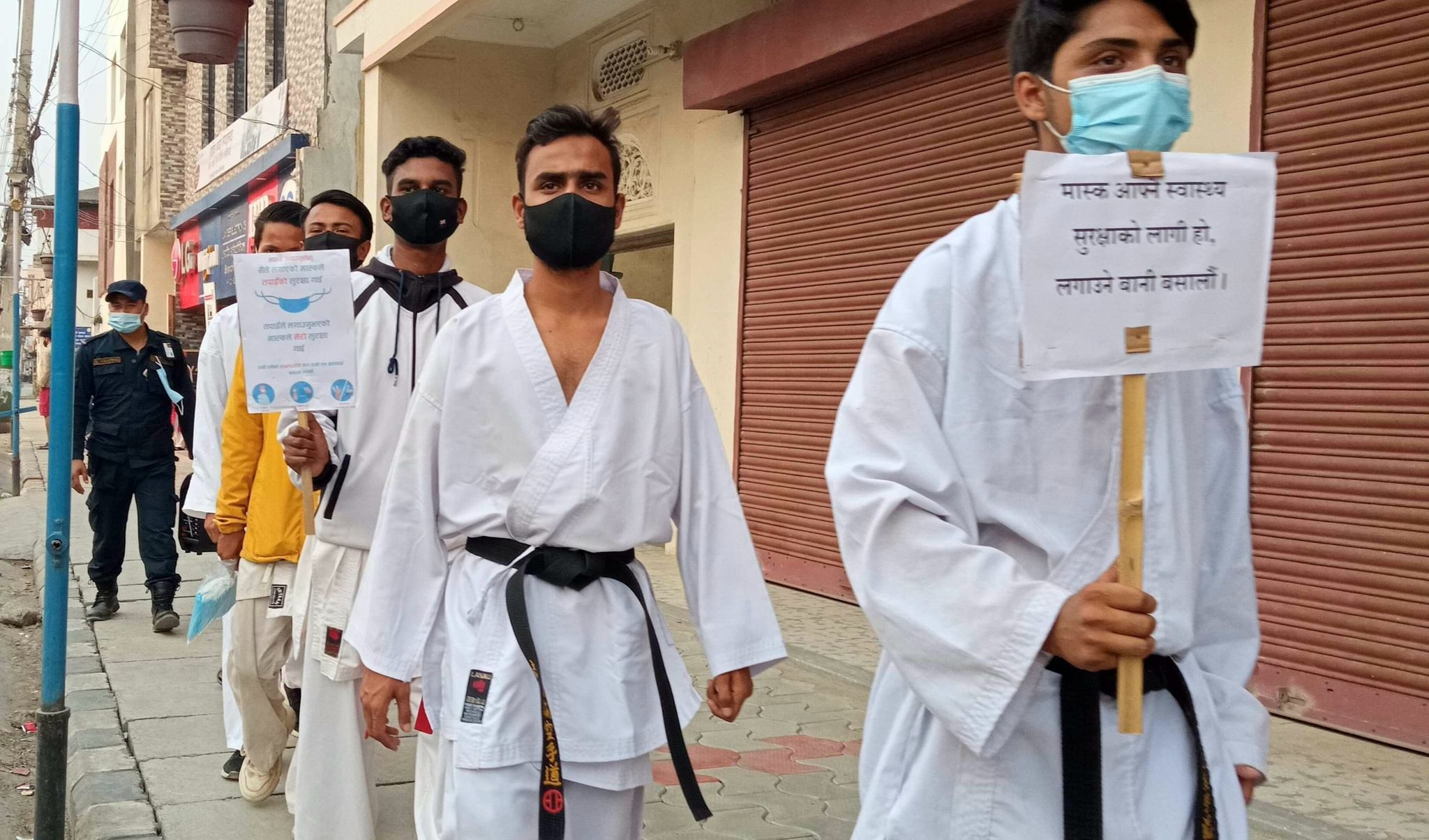 बिराटनगर । विराटनगरमा विभिन्न निकायले सुरु गरेको तपाँईको मास्क खोई ? सचेतना अभियानलाई पोखरिया कराँते डोजोले समेत सञ्चालन गरेको छ । अहिले बिश्वब्यापी रुपमा बढी रहेको कोरोना भाइरसको संक्रमणबाट जोगिन सचेतना फैलाउँदै पोखरिया डोजोले सर्वसाधारणसम्म पुगेर आग्रह गरेको हो ।