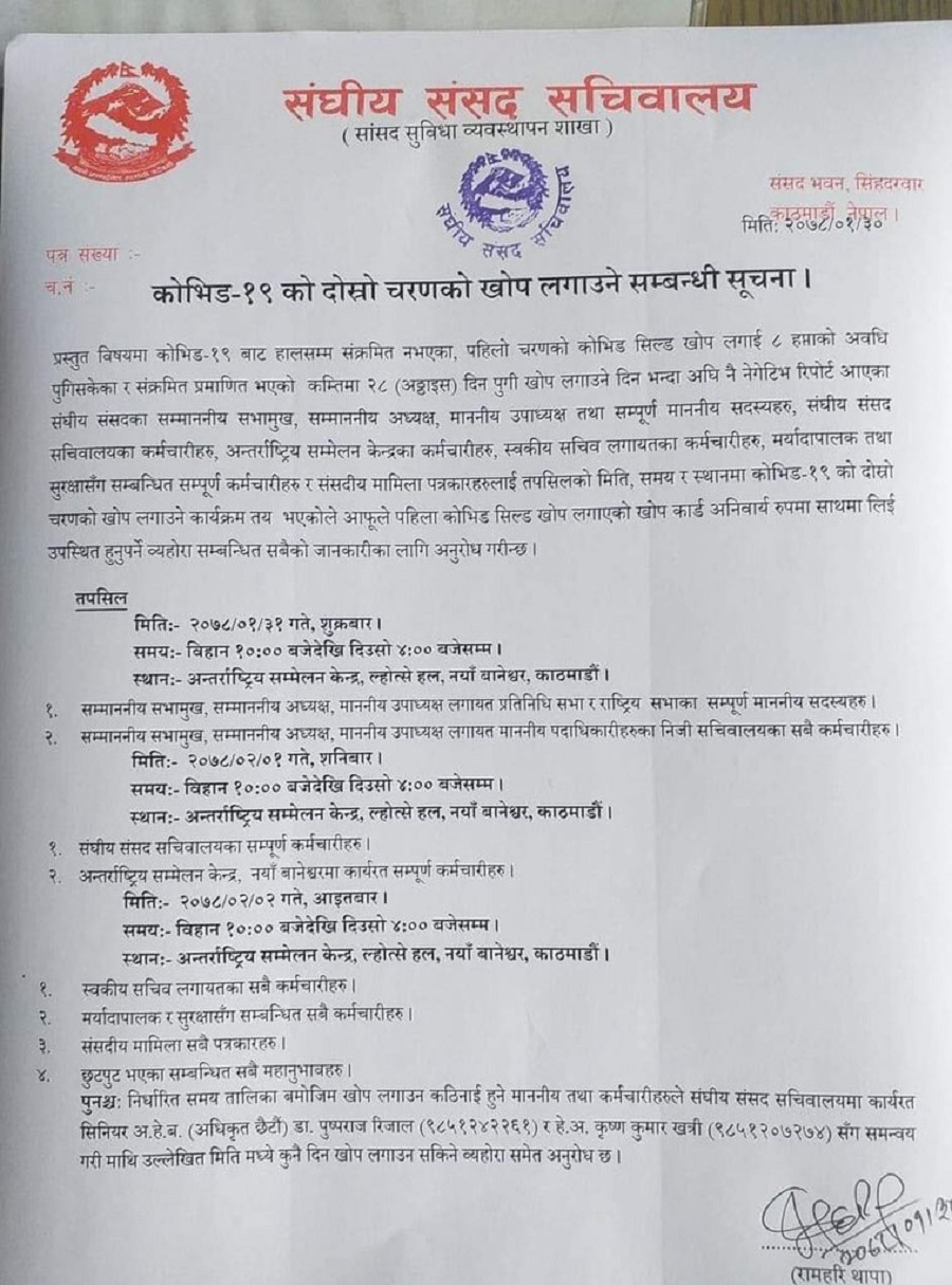 शुक्रबारदेखि आइतबारसम्म सभामुख, राष्ट्रिय सभाका अध्यक्ष, संसद सचिवालयका कर्मचारी र पत्रकारहरूलाई कोभिसिल्ड खोपको दोस्रो डोज लगाइने सचिवालयले जनाएको हो । अन्तर्राष्ट्रिय सम्मेलन केन्द्रको ल्होत्से हलमा बिहान १० बजेदेखि दिउँसो ४ बजेसम्म खोप लगाइने छ। खोपको दोस्रो डोज लगाउने भएको छ। संसद सचिवालयले प्रतिनिधि सभा र राष्ट्रिय सभाका सदस्य तथा कर्मचारीहरूलाई शुक्रबारदेखि कोरोनाभाइरसविरूद्धको खोपको दोस्रो डोज लगाउन लागिएको जनाएको हो ।