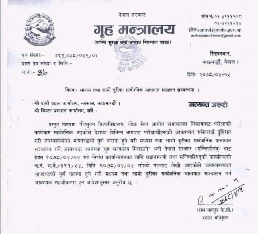 साउन ४ गते निर्णय कार्यान्वयन गर्न क्याबिनेटबाट प्राप्त पत्रको आधारमा गृहले लोकसेवा आयोग, विश्वविद्यालयलगायतका निकायबाट परीक्षाको कार्यक्रम सार्वजनिक भएको अवस्थामा सबै यातायात खुल्ला राख्न आदेश दिएको हो । गृहको परिपत्रमा देशका विभिन्न भागबाट परीक्षार्थीहरूको आवागमन समेतलाई दृष्टिगत गरी जनस्वास्थ्यका मापदण्डको पूर्ण पालना हुने गरी मध्यम तथा लामो दूरीका सार्वजनिक यातायात सञ्चालन गर्ने आवश्यक भएकाले सोही अनुसारको व्यवस्था मिलाउन निर्देशन दिइएको छ ।