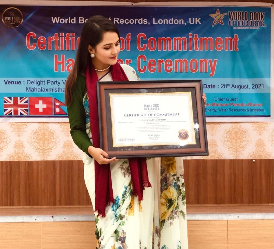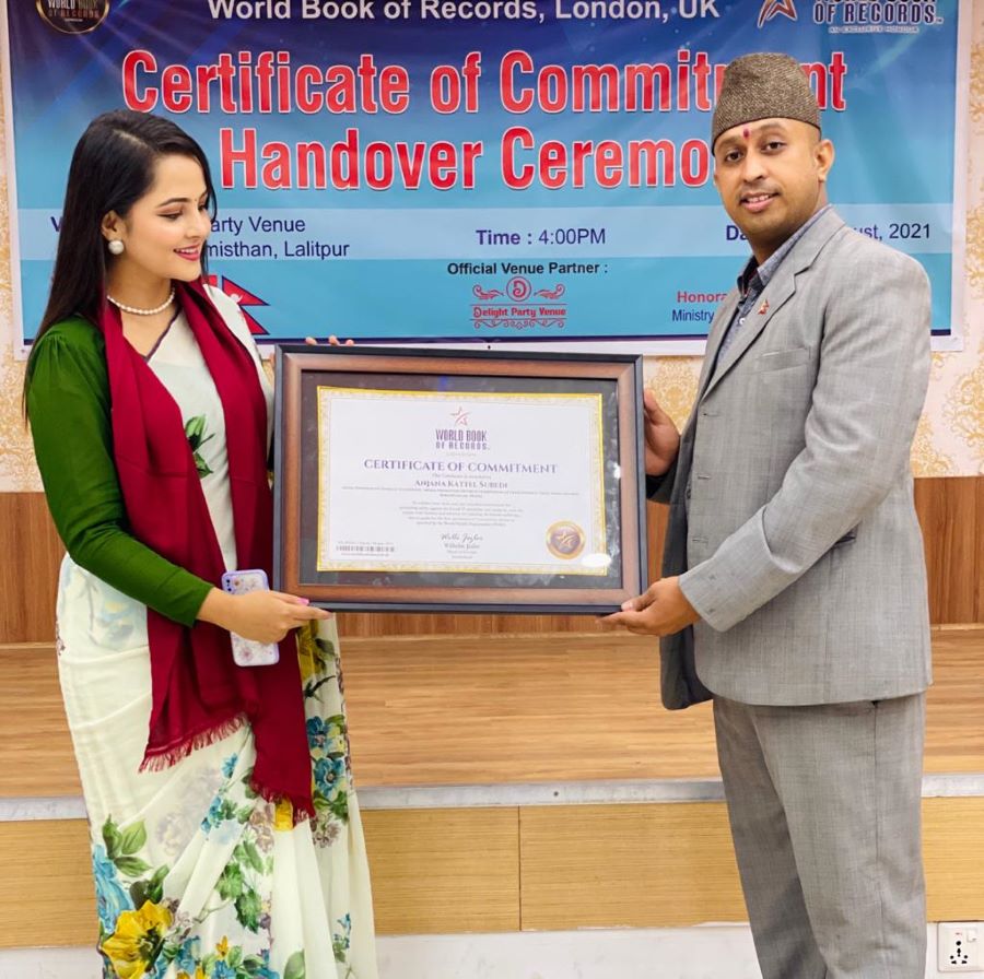 लायन्स क्लब अफ विराटनगर 'इन्भिजन' की चार्टर प्रेसिडेन्ट अञ्जना कट्टेल सुवेदी वेलायतको लन्डनस्थित वर्ल्ड बुक्स अफ रेकर्डसको प्रतिबद्धताको प्रमाणपत्रबाट सम्मानित भएकी छिन् ।