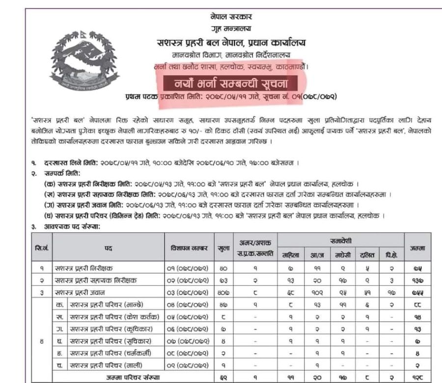 सशस्त्र प्रहरी बलले प्रहरी निरीक्षकदेखि परिचरसम्म विभिन्न पदमा नयाँ भर्ना आह्वान गरेको छ।