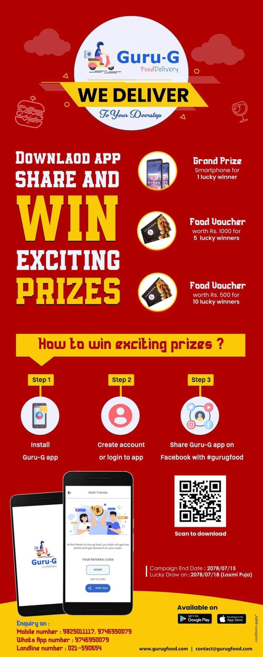‘गुरुजी फूड डेलिभरी’ले आफ्ना परिवार तथा नजिकका साथीभाईलाई यो सेवा लिनका लागि प्रोत्साहन वा सिफारिस गर्न भनेको छ । यो अफर यही कार्तिक १५ गतेसम्म लागु हुनेछ । यसको नतिजा भने कार्तिक १८ गते लक्ष्मीपूजाको दिन सार्वजनिक हुनेछ ।