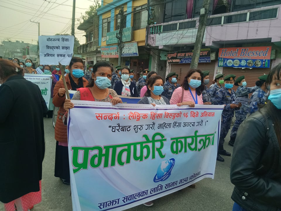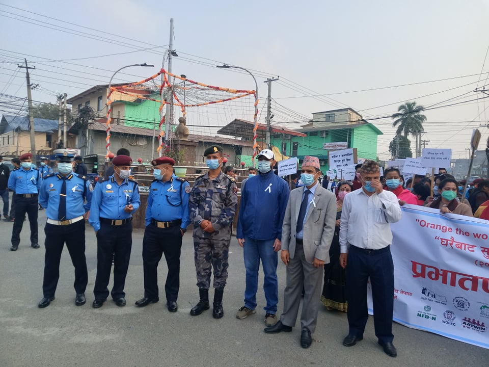 विराटनगर । लैगिंक हिंसा विरुद्धको १६ दिने अभियान अन्तर्गत विराटनगरमा आज प्रभातफेरी निकालिएको छ । ‘घरैबाट सुरु गरौं, लैगिंक हिंसा अन्त्य गरौं’मूल नारासहित विराटनगरमा प्रभातफेरी निकालिएको हो ।