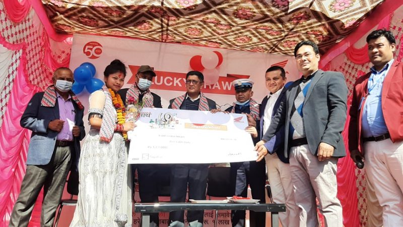 लक्की ड्रमार्फत पुरस्कार जितेकी चौधरीलाई कम्पनीले बिहीबार विराटनगरमा एक कार्यक्रम आयोजना गरि पुरस्कार रकम हस्तान्तरण गरेको हो । चौधरीले जितेकी १ लाखको चेक १ नं. प्रदेशको स्याकार टे«डिङ्ग कम्पनी प्रालिका म्यानेजर सन्तोष थापा र शोरुम म्यानेजर मदन श्रेष्ठले संयुक्त रुपमा हस्तान्तरण गरेका थिए ।