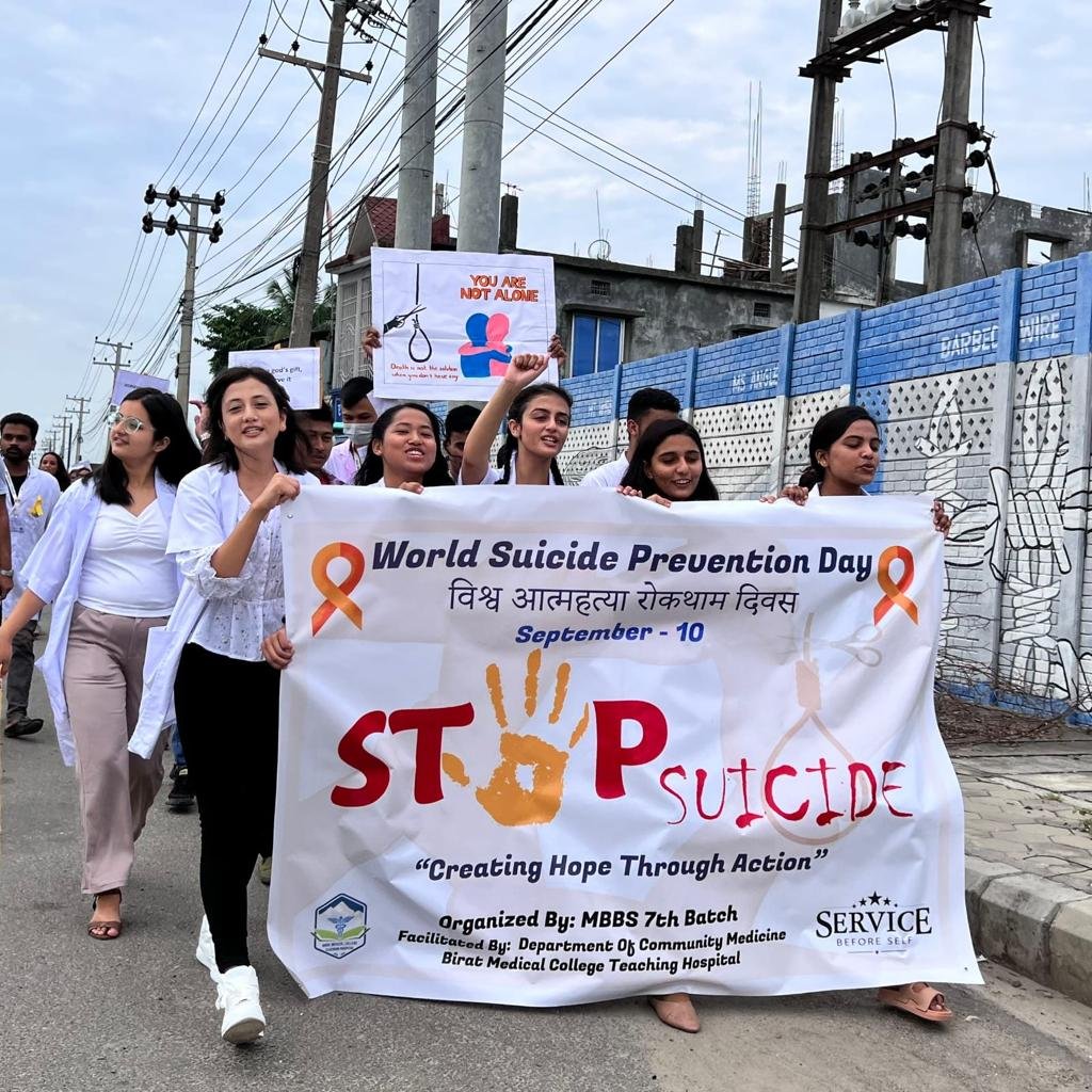 उक्त अवसरमा विराट मेडिकल कलेजमा अध्ययनरत सातौं व्याचका विद्यार्थीहरुको संग्लता र नेतृत्वमा सचेतनामूलक नाटक, र्र्यलीको आयोजना गरेका थिए । साथै आत्महत्या रोकथाममा आफ्नो समर्थन र साथ बनाउनको लागि शान्ति दिप प्रज्वलनको कार्यक्रम समेत गरेका थिए ।