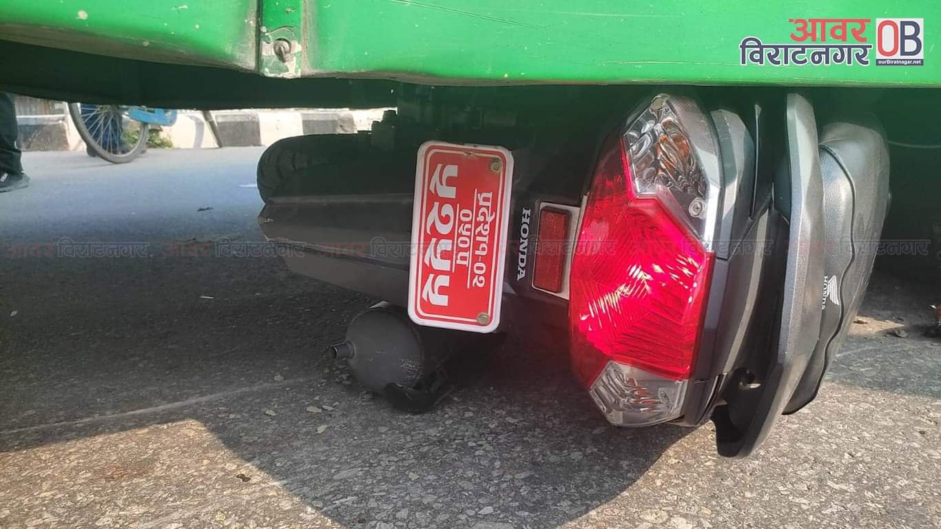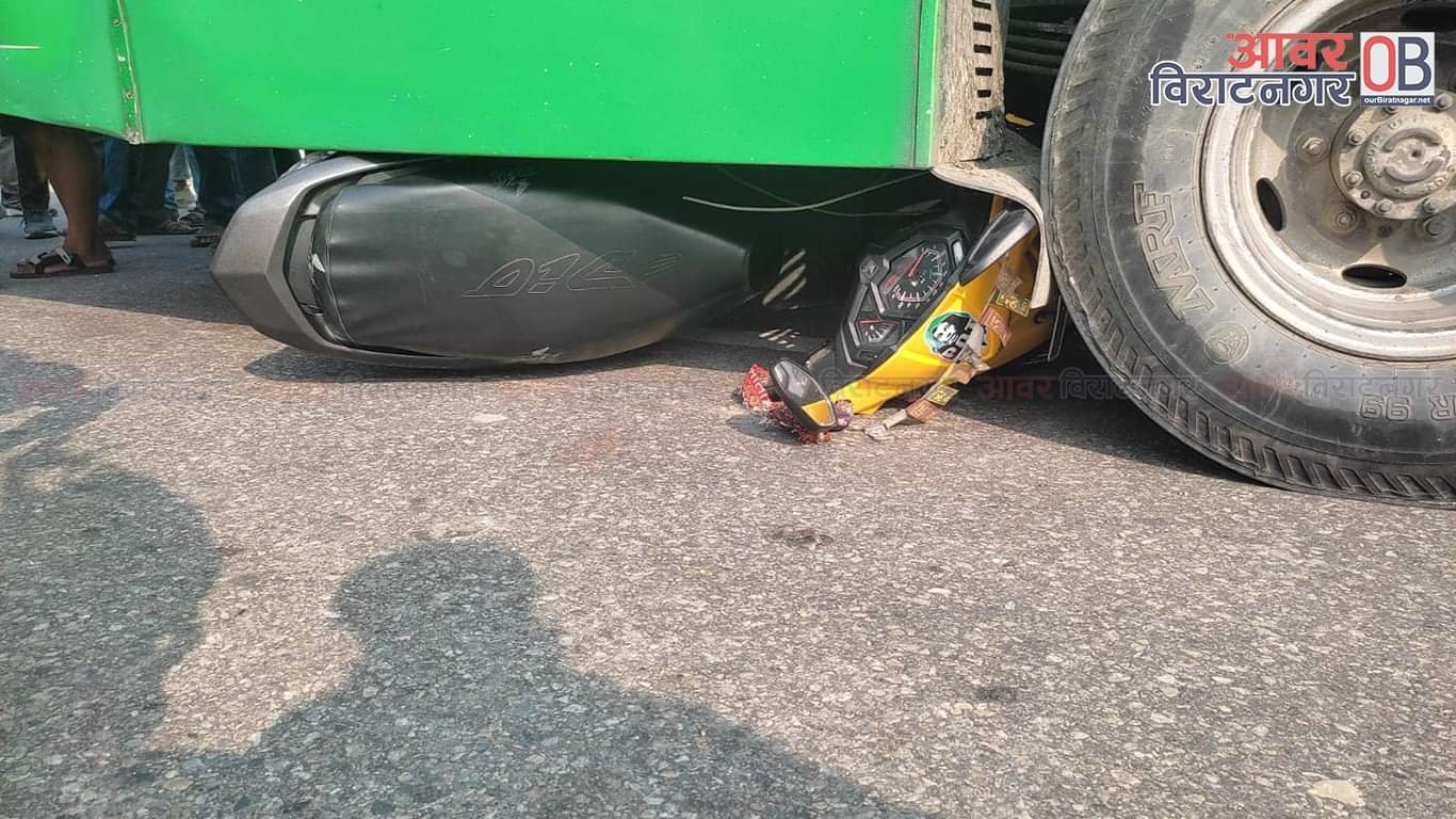 उत्तरबाट दक्षिणतर्फ आउँदै गरेको प्रदेश १–०२–०५० प ५२५५ को स्कुटर र मे १ ख २६६९ नम्बरको बससंग ठोकिदा बसको मुनि स्कुटर पसेको जिल्ला ट्राफिक कार्यालय मोरङले जनाएको छ ।