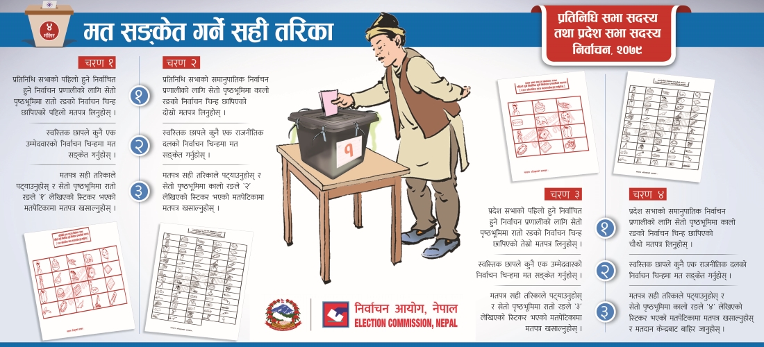 आयोगले मतदान गर्ने सही तारिकाका बारेमा जानकारी गराएको छ । मतदान गर्दा मतपत्र बदर नहोस् भन्नेबारेमा सचेत गराइएको हो ।