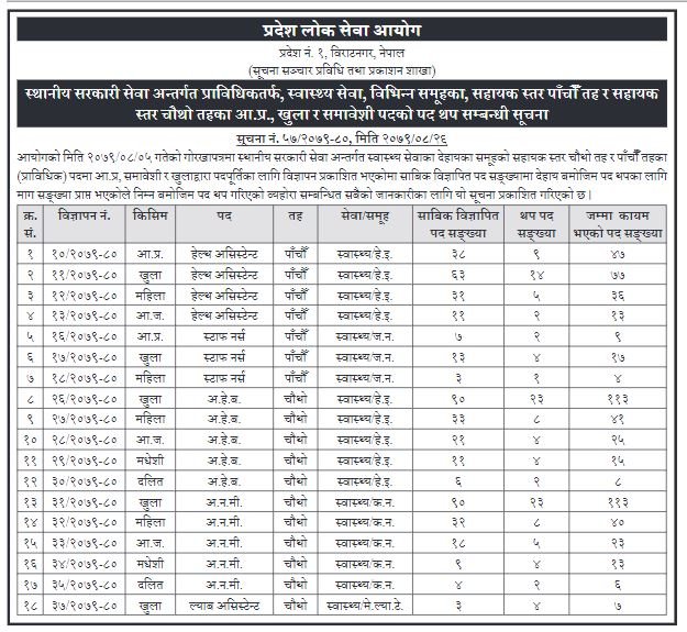 गोरखापत्र राष्ट्रिय दैनिकमा आइतबार सूचना जारी गर्दै हेल्थ असिस्टेन, स्टाफ नर्स, अहेब, अनमी, ल्याब असिस्टेनको माग गरेको हो ।