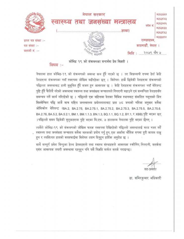 मन्त्रालयका सहप्रवक्ता डा. समिरकुमार अधिकारीले फरक स्वरूपमा कोरोना संक्रमणको जोखिम देखिएकोले पछिल्लो अवस्थालाई मध्यनजर गर्दै सबैमा मास्कको प्रयोग गर्न आग्रह गर्दै विज्ञप्ति निकालेका छन्।