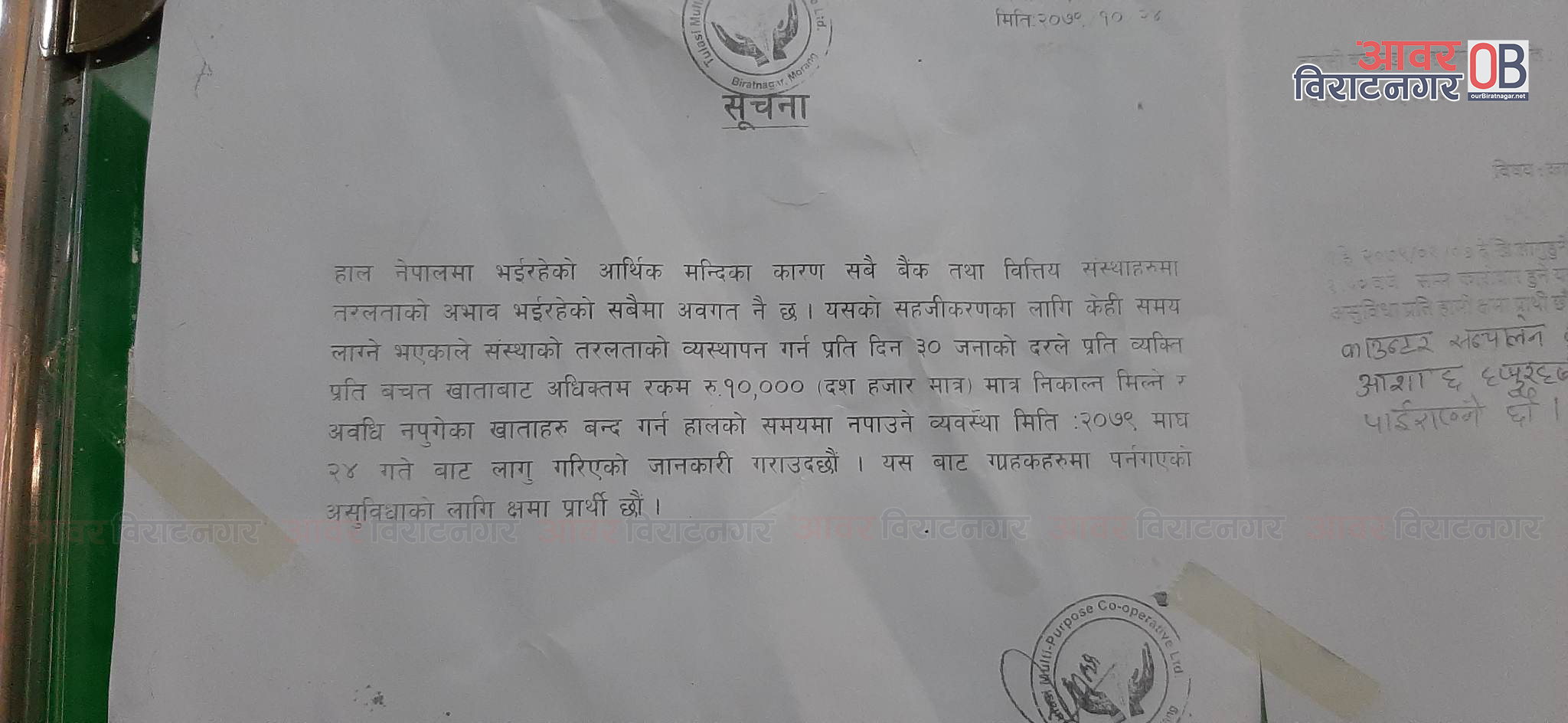 सहकारीले टाँसेको सुचनामा भने हाल विश्वब्यापी रुपमा भईरहेको आर्थिक मन्दिको प्रभाव परेको उल्लेख छ । लगानी गरेको रकम फिर्ता नआउँदा समस्या परेको उल्लेख गरिएपनि सञ्चालक सम्पर्कमा नआउँदा र बचतकर्ता सामु सहकारीको अवस्था सार्वजानिक नगर्दा समस्या देखिएको छ ।