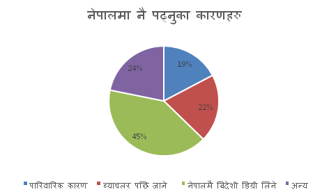 ६१ प्रतिशत विद्यार्थीहरूले विदेश जाने सोच बनाएकोमा बाँकी ३९ प्रतिशत विद्यार्थीहरू नेपालमा नै अध्ययन गर्ने बताइरहँदा यस सर्वेक्षणमा नेपालमै पढ्ने भन्ने बताएका विद्यार्थीहरुलाई पून प्रश्न गरिएको थियो । नेपालमा पढ्ने विकल्प रोजेका हाई स्कुल ग्राजुएटहरुलाई किन नेपालमा पढ्ने निर्णय लिएको भनी प्रतिप्रश्न गरिएकोमा निम्न उत्तरहरू पाइयो ।