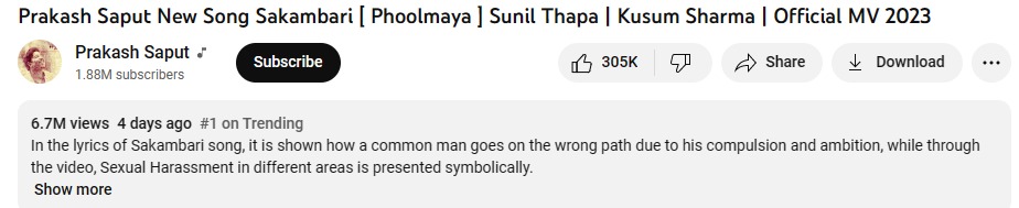 फ़ुलमायाको वस्तुकरण अथवा यथार्थ भन्ने विषयमा धेरै कमेन्टहरु पढिसके पछि मलाई प्रकाश सपुत ज्युको गीत सुन्न - हेर्न मन लाग्यो र हेरे , मैले सुरुमा क्यापसन पढे त्यहाँ लेखिएको छ “In the lyrics of Sakambari song, it is shown how a common man goes on the wrong path due to his compulsion and ambition, while through the video, Sexual Harassment in different" अर्थात एउटा साधारण मानिस आफ्नो अनिवार्यता (कम्पल्शन) र महत्वाकांक्षा (एम्बिसन को कारणले कसरी गलत बाटोमा जान्छन भन्ने कुरा सकम्बरी गीतले देखाउदछ र भिडियो मार्फत विभिन्न क्षेत्रमा हुने यौन उत्पीडन(सेक्सुअलह्यारेस्मेण्ट) लाई प्रतीकात्मक रुपमा प्रस्तुत गरिएकोछ।"