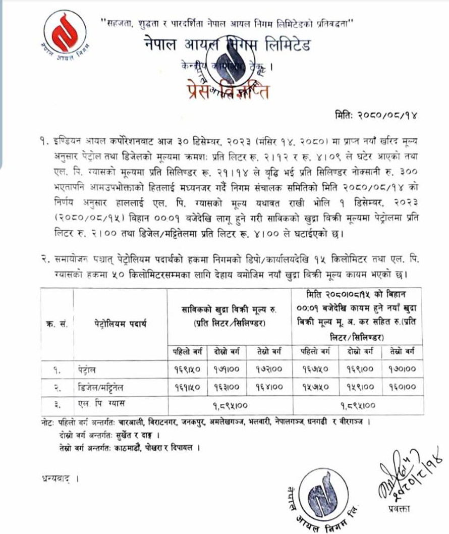 निगमले पहिलो, दोस्रो र तेस्रो वर्गका क्षेत्रमा पेट्रोलको मूल्य प्रतिलिटर क्रमश ः एक सय ६७ रुपैयाँ ५० पैसा, एक सय ६९ रुपैयाँ र एक सय ७० रुपैयाँ तोकेको छ । यस्तै पहिलो, दोस्रो र तेस्रो वर्गका क्षेत्रमा डिजेल/मट्टितेलको मूल्य प्रतिलिटर क्रमशः एक सय ५७ रुपैयाँ ५० पैसा, एक सय ५९ रुपैयाँ र एक सय ६० रुपैयाँ कायम गरेको छ ।