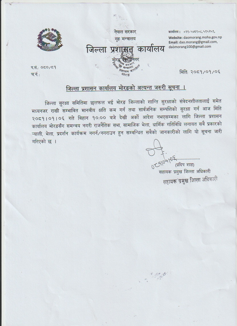 ‘जिल्ला सुरक्षा समितिमा छलफल भई मोरङ जिल्लाको शान्ति सुरक्षाको संवेदनशीलतालाई समेत मध्यनजर राखी सम्भावित मानवीय क्षति कम गर्न तथा सार्वजनिक सम्पत्तिको सुरक्षा गर्न आज मिति २०८१।०१।०६ गते विहान १०ः०० बजे देखी अर्को आदेश नभएसम्मका लागि जिल्ला प्रशासन कार्यालय मोरङसँग समन्वय नगरी राजनैतिक सभा, सामाजिक भेला, धार्मिक गतिविधि लगायत सबै प्रकारको र्याली, भेला, प्रदर्शन कार्यक्रम नगर्न/नगराउन हुन सम्बन्धित सबैको जानकारीको लागि यो सूचना जारी गरिएको छ ।’ सहायक प्रमुख जिल्ला अधिकारी प्रदिपकुमार साहले जारी गरेको सूचनामा उल्लेख छ ।