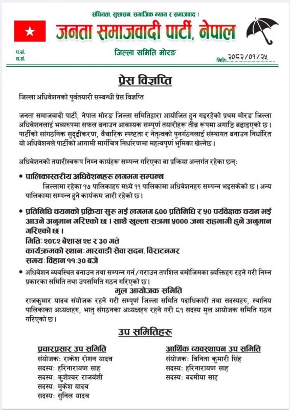 विराटनगर । जनता समाजवादी पार्टी नेपाल मोरङको प्रथम जिल्ला अधिवेशन बैसाख २९ र ३० गते हुने भएको छ ।