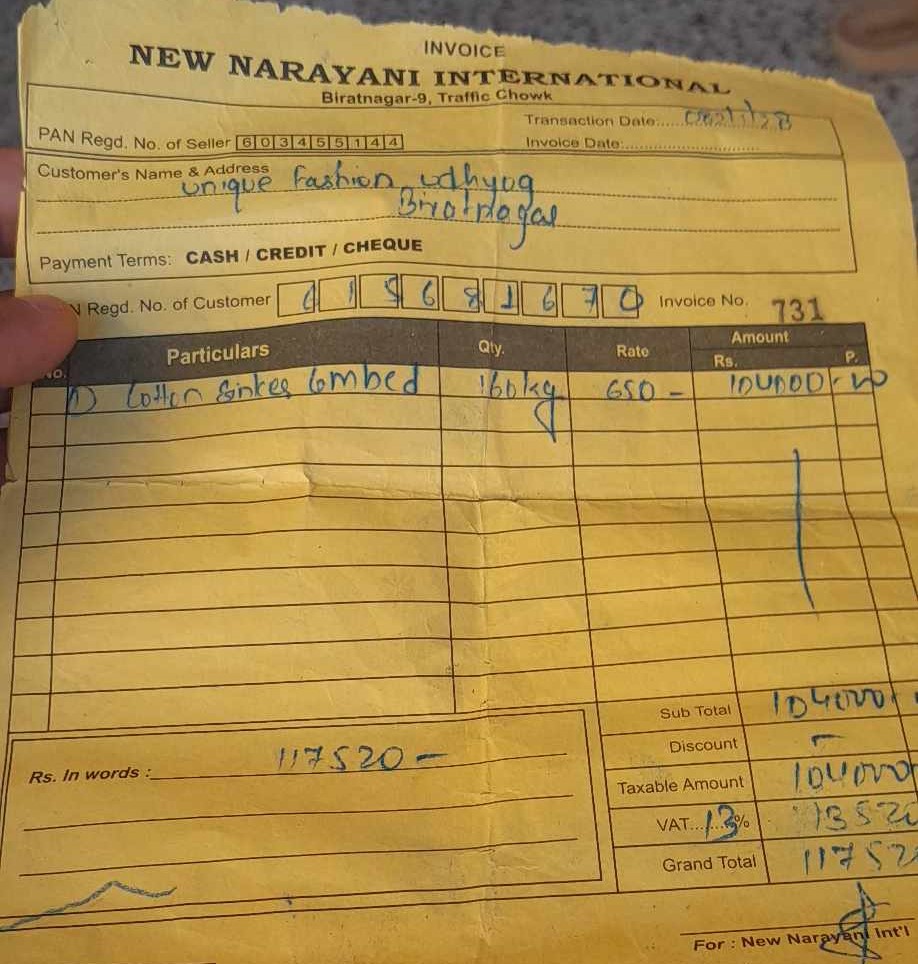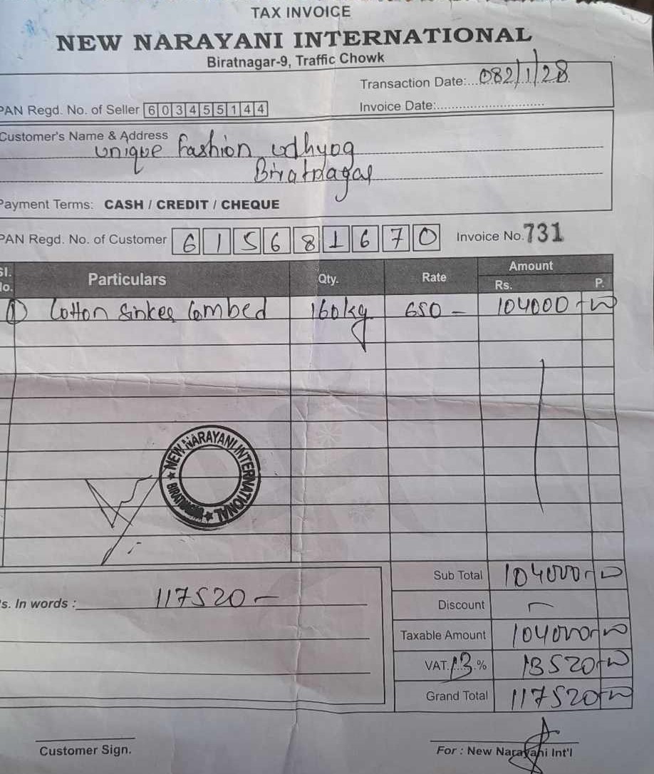 उद्योगका सञ्चालक जमसेद मास्टर हुन् । उनका प्रतिनिधि मिराज अन्सारीले भन्सारले अनावश्यक दुःख दिएको गुनासो गरे । अन्सारीका अनुसार भनेको सबै प्रमाण दिदाँ समेत मुद्दा चलाएर गरिखान नदिएको आरोप लगाए । प्रमुख भन्सार अधिकृत श्रेष्ठले समान पक्राउ परेपछि बिलबिजक जारी गरेको दावी गरे । उद्योगले २८ गते माइक्रो टालसन मिक्स फेब्रिक ९० केजी र कटन सिन्केर कम्बेड ९० केजी गरिद गरेको बिलमा उल्लेख छ ।