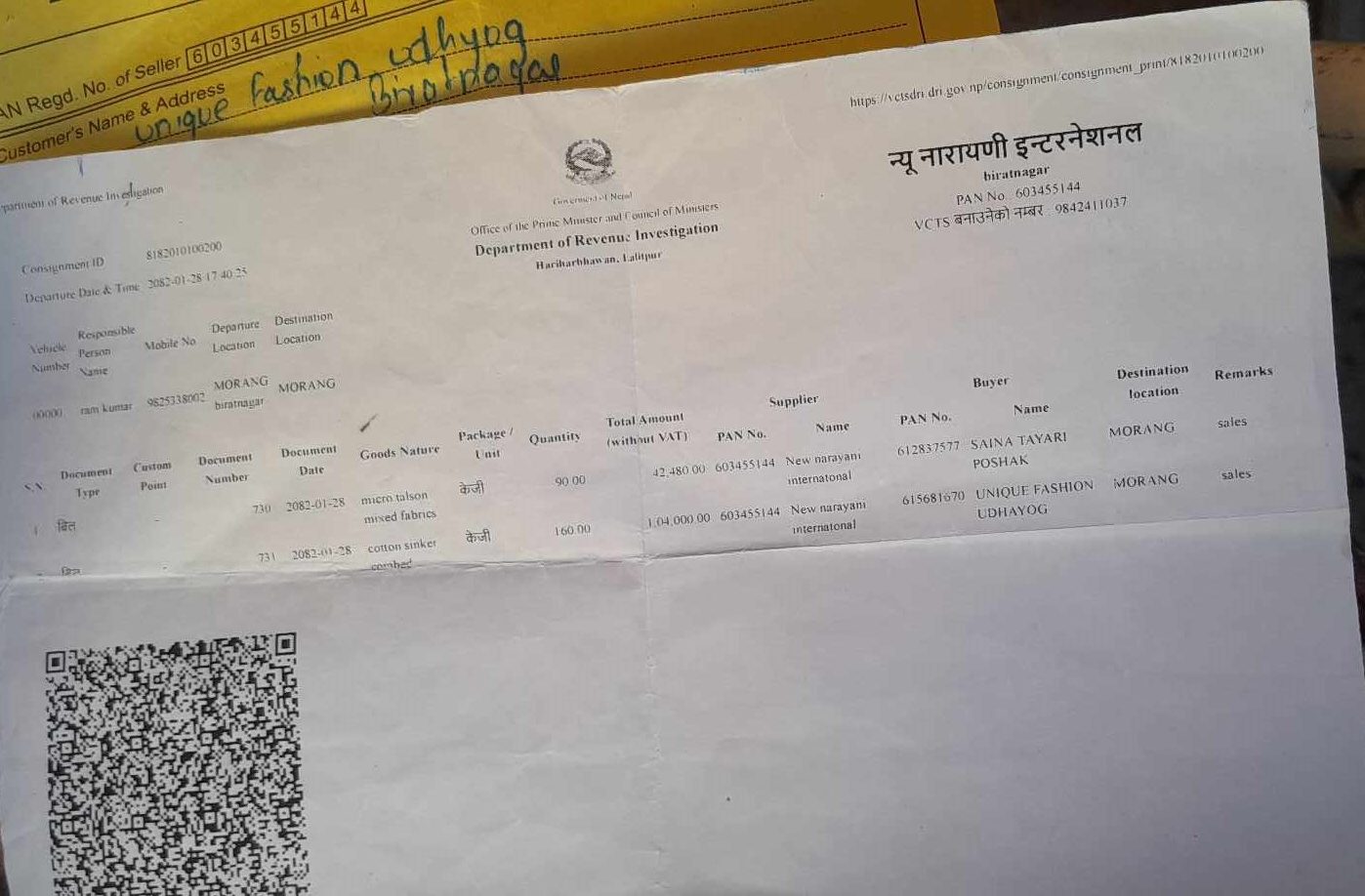 विराटनगर । विराटनगर–१५ स्थित यूनिक फेसन उद्योगले प्रिन्टका लागि चलान गरेको ९१० थान कपडा भन्सार कार्यालयले गत बैशाख ३१ गते पक्राउ गरियो । सिटी सफारीमा विराटनगर बरगाछी पठाएको साना बाटोमै पक्राउ परेपछि भन्सार कार्यालय पु¥याइयो । उद्योगले कच्चा कपडा न्यू नारायणी इन्टरनेशलबाट खरिद गरेर भिसिटिएससहितको बिलबिजक जारी भएको थियो । तर, उद्योगले कच्चा कपडा खरिद गरेर रेडिमेड कपडामा प्रिन्टका लागि पठाएको थियो ।