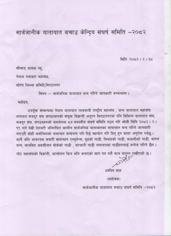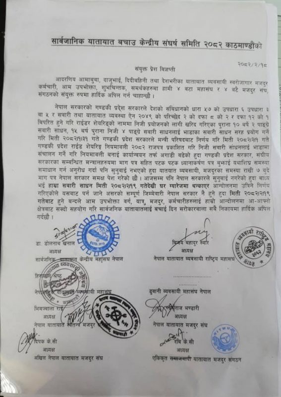 व्यावसायीहरुले सम्बन्धित निकायलाई ध्यानाकर्षण पत्र बुझाई यथाशीघ्र समस्या समाधान गर्न अनुरोध गर्दा पनि सुनुवाइ नभएपछि सवारी साधन घर तथा ग्यारेजमा थन्क्याएर आन्दोलनमा उत्रिने निर्णय गरिएको प्रेस विज्ञप्ती जारी बन्दको घोषणा गरेको हो ।