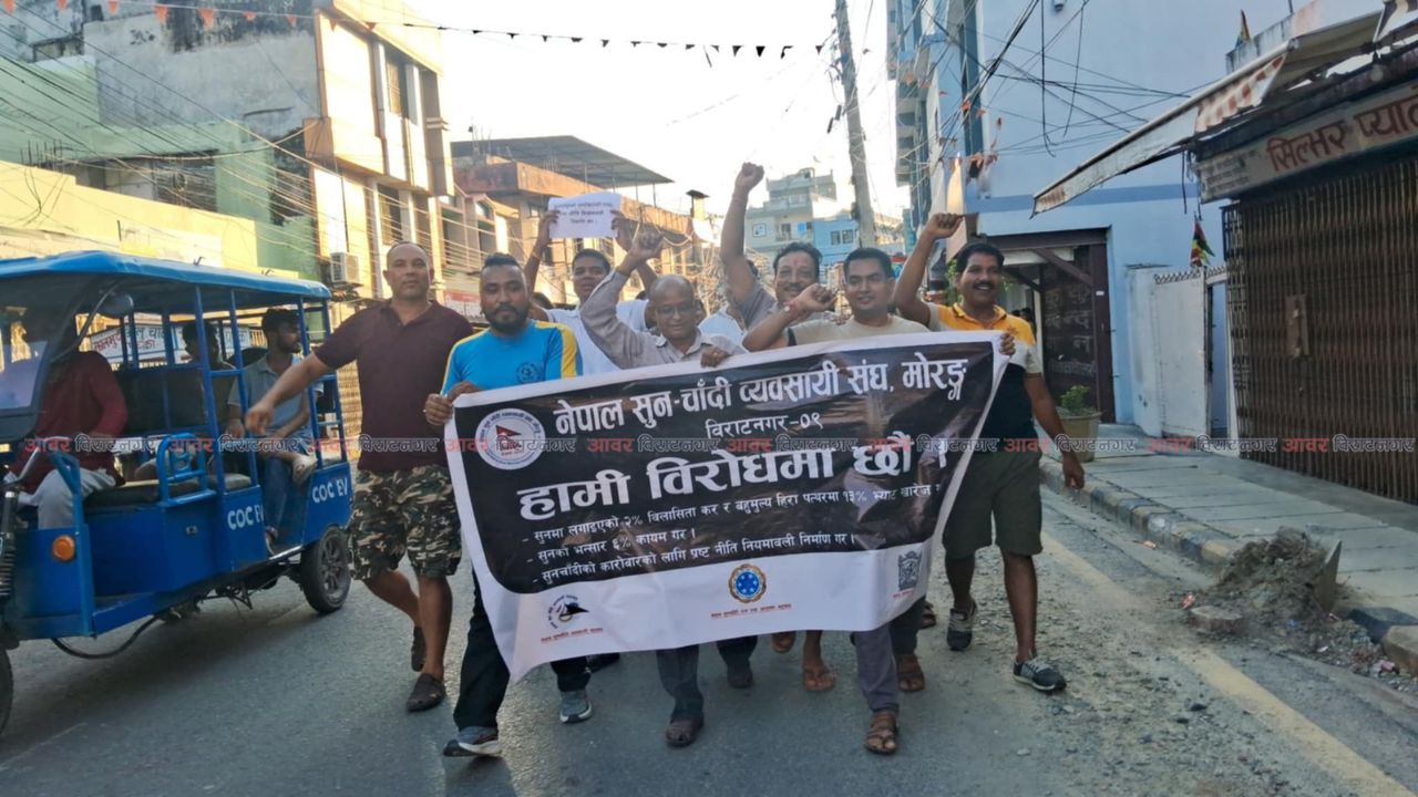 व्यवसायी पसल बन्ल गरेर सरकारको गलत कर नीतिका विरुद्ध विराटनगरमा प्रदर्शन गरेका छन् । व्यवसायीले विराटनगर– ठाकुरबाडी रोडस्थित नेपाल सुन–चाँदी व्यवसायी संघको कार्यालयबाट निकालिएको र्याली नगर क्षेत्रको विभिन्न भागको परिक्रमा पछि बुधहाट चौकमा विरोध सभा गरेका थिए।