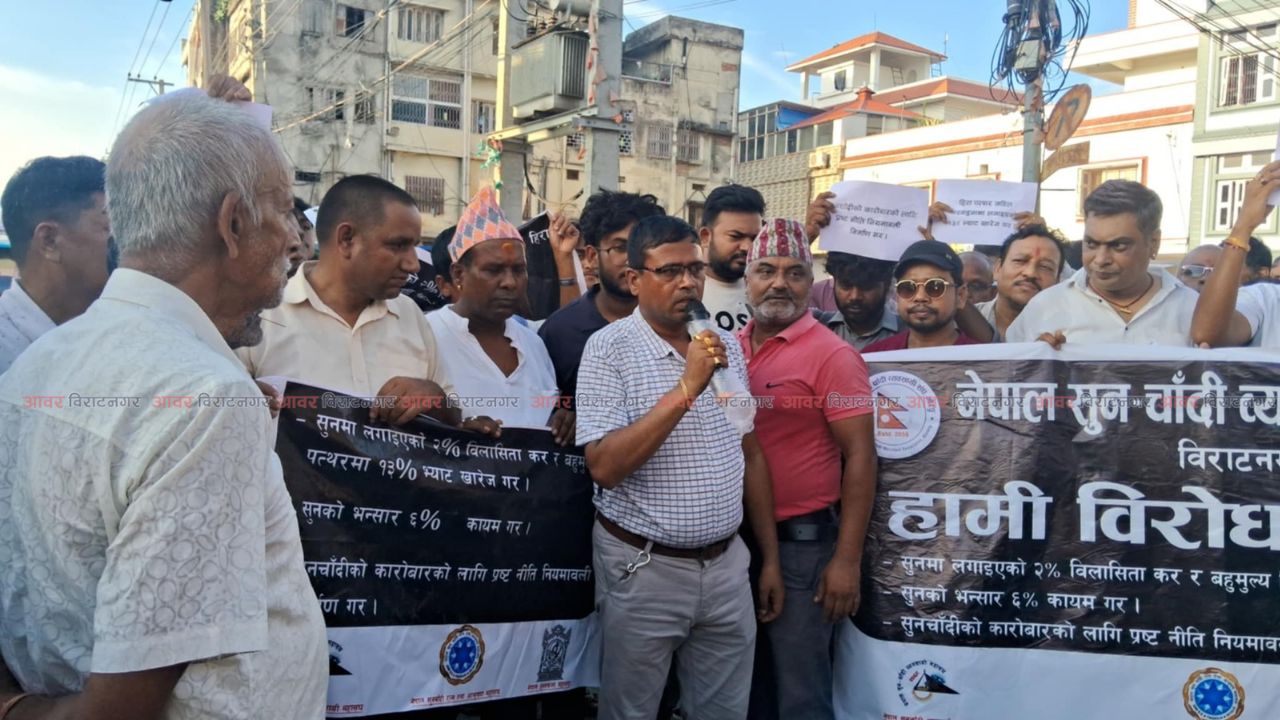 विरोध सभामा नेपाल सुन–चाँदी व्यवसायी संघ विराटनगर मोरङका अध्यक्ष शशिभुषण साह र शोभा प्याकुरेलले सरकारको गलत कर नीति खारेज नभएसम्म आन्दोलन जारी रहने चेतावनी दिए ।