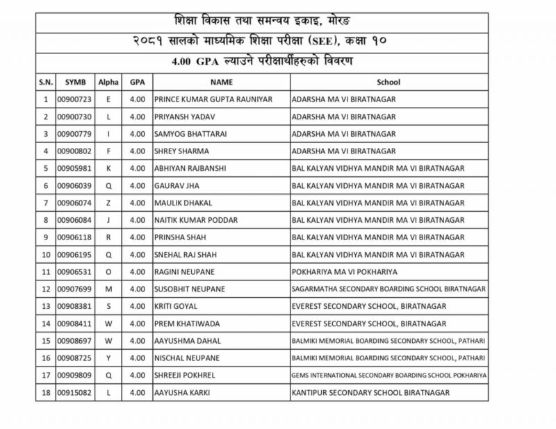 सबैभन्दा बढी ४ जिपिए ल्याउने विद्यार्थीहरू विराटनगरको बाल कल्याण विद्या मन्दिर स्कुलबाट रहेका छन् । सो विद्यालयका ६ जना विद्यार्थीले पूर्ण अंक ल्याएर शैक्षिक उत्कृष्टता प्रदर्शन गरेका हुन् । ती विद्यार्थीहरूमा अभियान राजवंशी, गौरव झा, मौलिक ढकाल, नैतिक कुमार पोद्दार, प्रिन्सा साह र स्नेतहल राज साह रहेका छन् । यसैगरी, विराटनगरकै सामुदायिक विद्यालय आदर्श माध्यमिक विद्यालयका चार विद्यार्थीले पनि ४ जिपिए ल्याउन सफल भएका छन् । उनीहरूमा प्रिन्स कुमार गुप्ता रौनियार, प्रियांश यादव, समयोग भट्टराई र श्रेय शर्मा रहेका छन् । सामुदायिक विद्यालयका विद्यार्थीबाट यस्तो उत्कृष्ट नतिजा आउनु गर्वको विषय बनेको छ ।