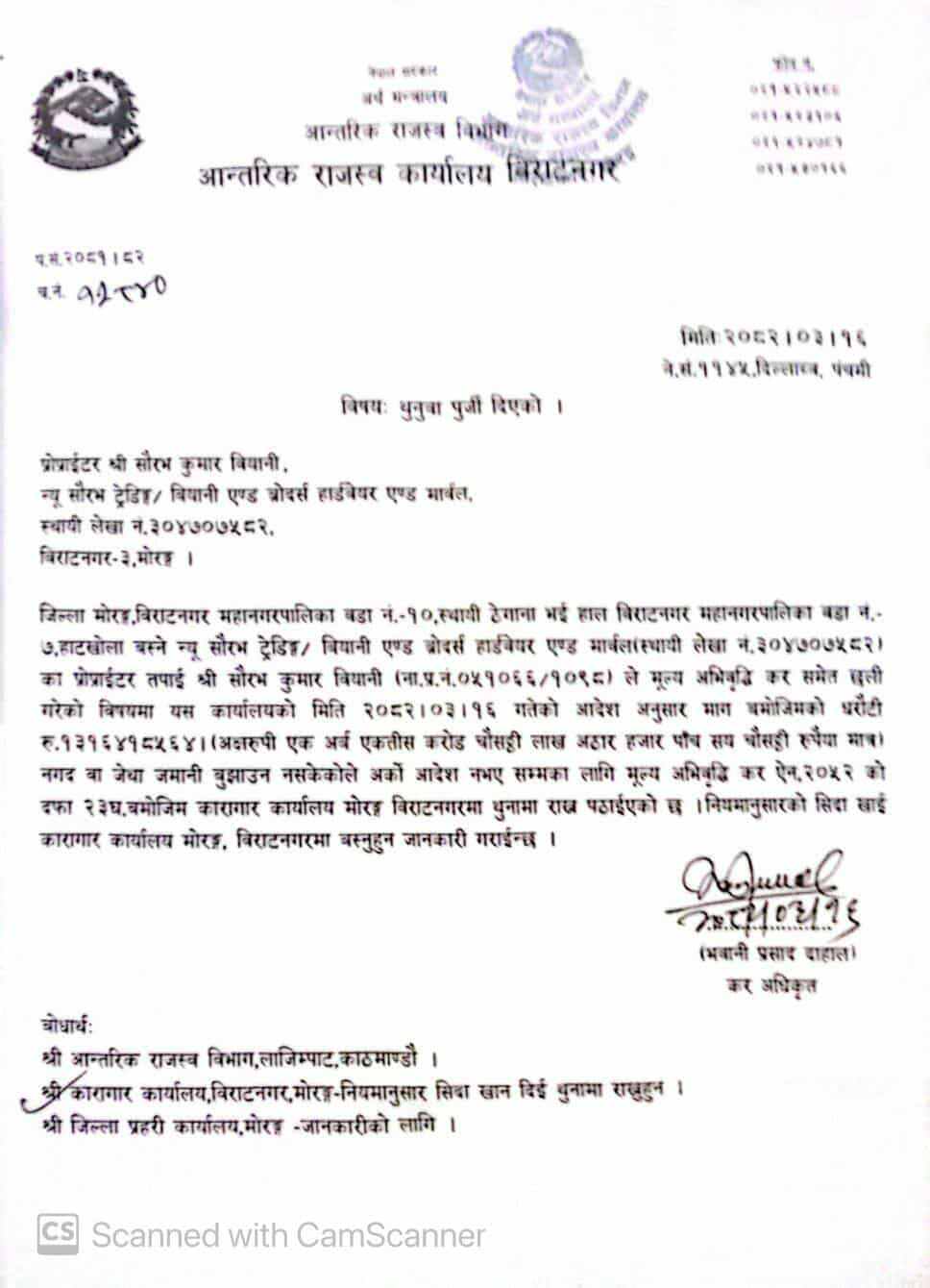 विराटनगर महानगरपालिका ३ मा सञ्चालित न्यू सौरभ ट्रेडिङ्ग÷बियानी एण्ड ब्रोदर्स हार्डवेयर एण्ड मार्वलले भ्याट छली गरेको आरोपमा अनुसन्धान गर्दा एक अर्ब ३१ करोड ६४ लाख ९८ हजार ५८४ रुपिँया बराबरको राजस्व छली गरेको भेटिएको थियो ।