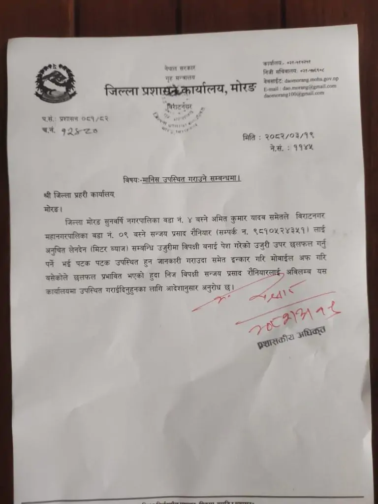 जिल्ला प्रशासन कार्यालय मोरङले बिहीबार मोरङ प्रहरीलाई पत्रचार गर्दै मन्टुलाई कार्यालयमा झिकाउन भनेको छ । मिटरब्याजी मन्टुविरुद्ध जिल्ला प्रशासन कार्यालय मोरङमा २० जना पीडितले उजुरी दिएका छन्। उजुरी परेपछि प्रशासनले छलफलमा एक हप्ता अगाडि पनि बोलाएको थियो। छलफलमा पुगेका उनी बेहोस भईदिएर हिँडिदिए । उनी बारम्बार यस्तो गरेर प्रशासनलाई छल्ने अनि जिल्लास्थित प्रशासनले अन्य काममा लाग्नुपर्ने स्थिति आएपछि गाउँगाउँमा पुगेर फेरी सर्वसाधारण धम्क्याउने गर्दै आएका छन् ।