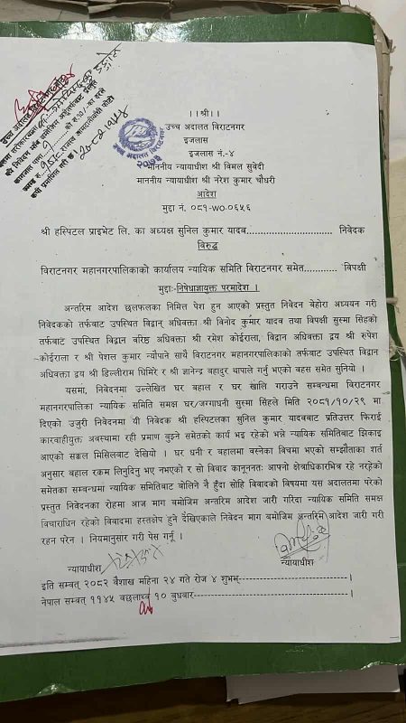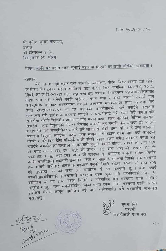 हस्पिटलले घरधनीलाई विचमा चेक पनि दिएको थियो । तर बैंकमा पैसा नभएपछि चेक बाउन्समा सञ्चालक सुनिल यादवलाई प्रहरीले पक्राउ समेत गरेको थियो । बैंकिङ कसुर आरोपमा यादवलाई जिल्ला प्रहरी कार्यालय मोरङले असार १ गते पक्राउ गरेको थियो ।