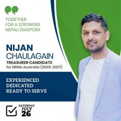 सिड्नी (अष्ट्रेलिया) । गैरआवासीय नेपाली संघ (एनआरएनए) अष्ट्रेलियाको आगामी कार्यकाल (२०२५–२०२७) का लागि कोषाध्यक्ष पदमा उम्मेदवारी दिएका निजन चौलागाईं पर्थ पुगेका छन् । आफ्नो चुनावी अभियानलाई तीव्र बनाउँदै चौलागाईं पर्थ पुगेका हुन् । समाजसेवा र व्यवसाय दुबै क्षेत्रमा सक्रिय चौलागाईं नेपाली समुदायमा लोकप्रिय तथा विश्वासिलो व्यक्तित्वका रूपमा चिनिन्छन् । उनी टिम सन्तोष कुँवरको तर्फबाट कोषाध्यक्ष पदका उम्मेदवार हुन् ।