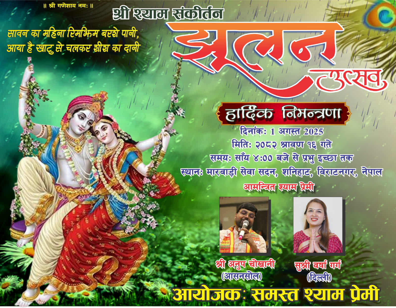 विराटनगर । श्याम भक्तिभावमा रमाउनेहरुको लागि एक विशेष अवसरको रुपमा श्री श्याम संकीर्तन झुलन उत्सव यही श्रावण १६ गते आयोजना हुने भएको छ। कार्यक्रम मारवाड़ी सेवा सदन, शनिहाट, विराटनगर मा साँझ ४ बजेबाट सुरु हुनेछ। उक्त संकीर्तन कार्यक्रममा विशेष अतिथिका रुपमा भारतबाट आमन्त्रित श्याम प्रेमी अनुप चोखानी र वर्षा गर्ग ले श्याम रसले भरिपूर्ण भजन संकीर्तन प्रस्तुत गर्नेछन्।