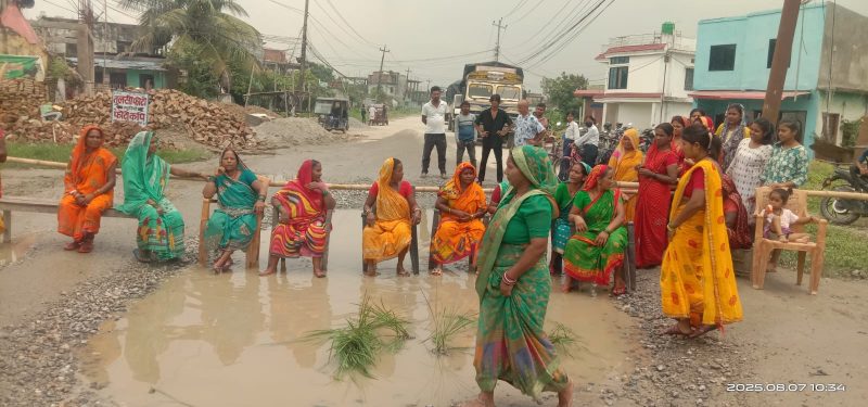 बिहीबार बिहान सो क्षेत्रमा स्थानीय महिलाहरुले सडककै बीचमा धान रोपेर विरोध प्रदर्शन गरेका हुन् । बर्षेनी वर्षातको समयमा हिलो र पानी जमेर सवारी आवगमनमा समस्या भएपछि सर्वसाधारण र सवारी चालकले ठूलो सास्ती खेप्न बाध्य भएका छन् । सडकको दयनीय अवस्थाबाट आजित भएका स्थानीय महिलाहरूले सडकको विचमा जमेको पानीमा धान रोपेर विरोध जनाएका छन् ।