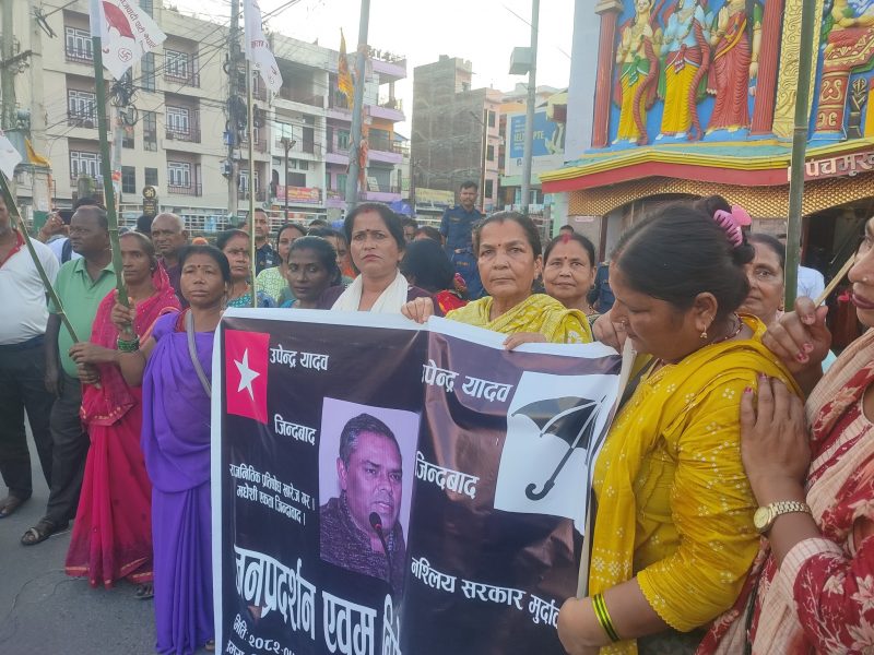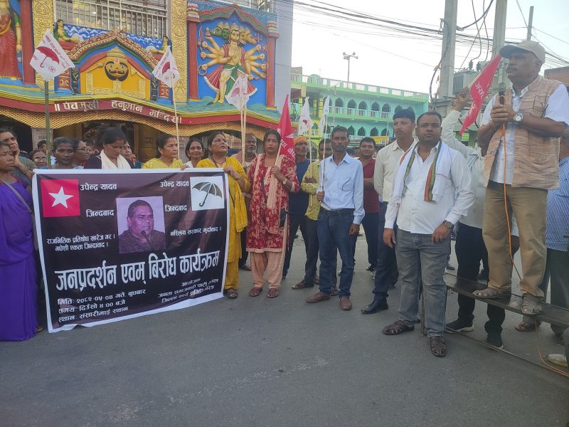 यता जनता समाजवादी पार्टी नेपाल मोरङले बुधबार विराटनगरको संसारी माइस्थानबाट निकालेको जुलुस नगर क्षेत्रको विभिन्न भागको परिक्रममा गर्दै बुधहाट चौक स्थित हनुमान मन्दिर अगाडि सडकमा विरोध सभा आयोजना गरेका थिए । विरोध कार्यक्रममा जनता समाजवादी पार्टी नेपालका केन्द्रीय कार्यकारिणी सदस्य सञ्जय सिंह ,जोगिलाल यादव, मोरङ अध्यक्ष राजकुमार यादव, सदिना खातुन लगायत नेता तथा कार्यकर्ताहरुको उपस्थिती रहेको थियो ।