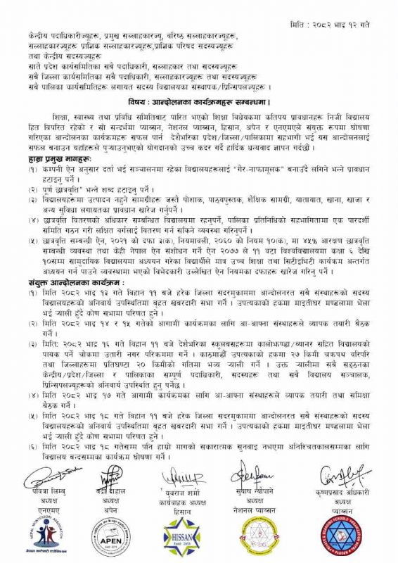 विद्यालय शिक्षा विधेयक सच्याउन माग गर्दै निजी विद्यालय सञ्चालकहरू निरन्तर रुपमा आन्दोलन गरिरहेका छन् । आन्दोलनका कार्यक्रम अन्तर्गतको पहिलो चरण बिहीबारबाट सकिएको छ । यस्तै भदौ १३ गतेदेखी १८ गते सम्म चरणबद्ध आन्दोलनका कार्यक्रम रहेका छन् । निजी विद्यालयले क्रमस् गैरनाफामूलक र पूर्ण छात्रवृत्तिविधेयकबाट हटाउनु पर्ने माग राखेर आन्दोलन गर्दै आएका छन् ।
