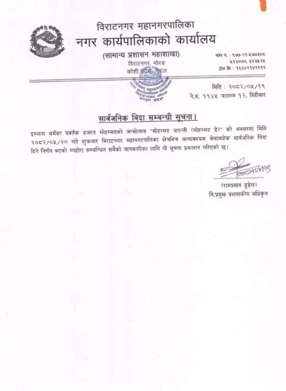महानगरभित्र रहेका अत्याआवश्यक बाहेकका सेवाहरुलाई सार्वजनिक विदा दिइएको जनाएको छ । महानगर प्रमुख निमित्त प्रशासकीय अधिकृत राम प्र.ढुङ्खेलद्धारा हस्ताक्षरित सार्वजनिक सुचनामा भदौ २० शुक्रबार इस्लाम धर्मका प्रवर्तक हजरत मोहम्मदको जन्मोत्सव (मोहम्मद डे) को अवसरमा विदा दिईएको जनाएको छ ।