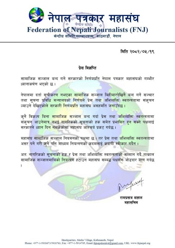 ‘नेपालमा दर्ता सूचीकरण नभएका सामाजिक सञ्जाल बिहीबारदेखिनै बन्द गर्ने सञ्चार तथा सूचना प्रविधि मन्त्रालयको निर्णयले प्रेस तथा अभिव्यक्ति स्वतन्त्रतामा संकुचन ल्याउने देखिएकोले सरकारी निर्णयप्रति महासंघ असहमति जनाउँदछ,’ महासचिव रामप्रसाद दाहालले जारी गरेको विज्ञप्तिमा भनिएको छ, ‘कुनै विकल्पबिना सामाजिक सञ्जाल बन्द गर्दा प्रेस तथा अभिव्यक्ति स्वतन्त्रतामा संकुचन आउनेमात्र नभई नागरिकको सूचनाको हक समेत प्रभावित हुन सक्ने पक्षलाई सरकारले ध्यान दिन नसकेकोमा महासंघ आश्चर्य प्रकट गर्दछ।’
