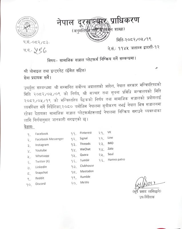 काठमाडौं । देशभित्र सामाजिक सञ्जाललाई बन्द गराउने सरकारको निर्णय कार्यान्वयमा अघि बढेको छ । सञ्चार तथा सूचना प्रविधि मन्त्रालयले बिहीबार गरेको निर्णयअनुसार नेपाल दूरसञ्चार प्राधिकरणले फेसबुकसहितका २६ वटा सामाजिक सञ्जाल बन्द गर्न इन्टरनेट सेवा प्रदायक कम्पनीहरूलाई निर्देशन दिएको हो ।