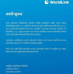 काठमाडौं । सरकारको निर्देशन अनुसार वल्र्डलिंक कम्युनिकेशन्स लिमिटेडले नेपालमा दर्ता नभइ सञ्चालनमा रहेका सामाजिक सञ्जाल प्लेटफर्महरू बन्द गरेको छ ।