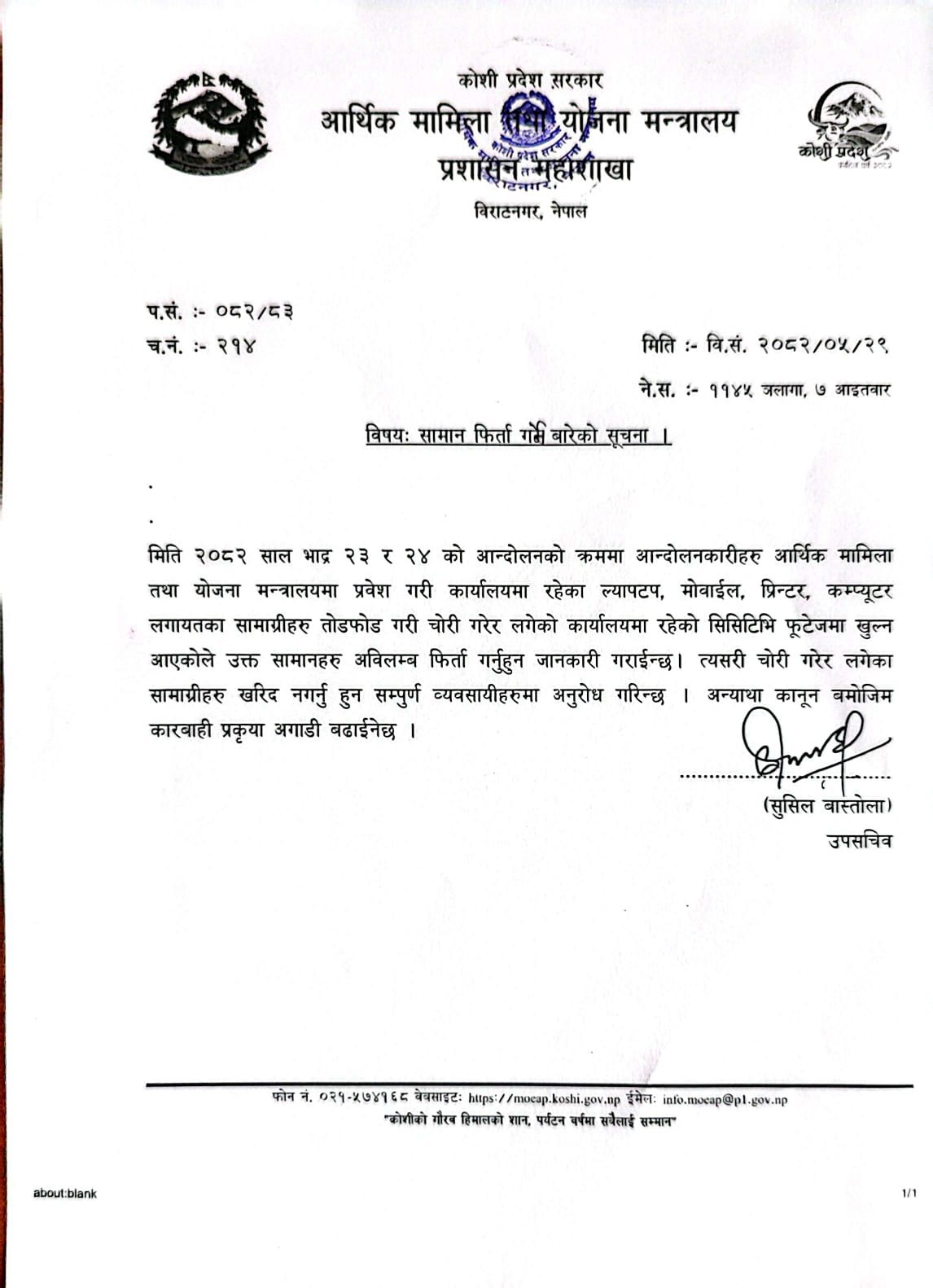 आइतबार मन्त्रालयतका सहसचिव सुशिल बास्तोलाद्वारा जारी विज्ञप्तिमा सिसी टिभी फुटेजमा मन्त्रालयमा प्रवेश गरेर ल्यापटप, मोवाइल, प्रिन्टर, कम्प्यूटर लगायतका सामाग्री चोरी गरेर लगेको देखिएकोले फिर्ता गर्न सम्बन्धित व्यक्तिहरुलाई आगग्रह गरिएको हो ।