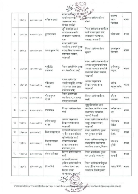 हाल जिल्ला प्रहरी कार्यालय मोरङमा नारायण प्रसाद चिमरीया रहेको स्थानमा कवित कटुवाल आउने भएका छन् । त्यसैगरी सुनसरीमा केवश थेवे, सप्तरीमा गौतम कुमार केसी, दाङमा दिपक श्रेष्ठ, पाल्पामा दिपेन्द्र पञ्जियार थारु, कास्कीमा नविन कार्की र कैलालीमा नरेन्द्र चन्दलाई पठाइएको छ ।