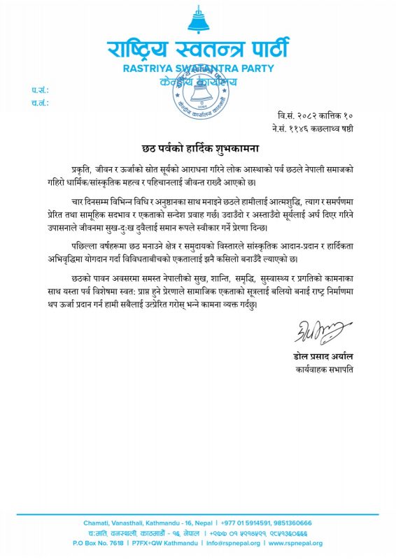 काठमाडौं । राष्ट्रिय स्वतन्त्र पार्टी (रास्वपा) का कार्यवाहक सभापति डोल प्रसाद अर्यालले छठ पर्वको अवसरमा सबै नेपालीमा सुख, शान्ति, समृद्धि र सुस्वास्थ्यको कामना गरेका छन् । छठ पर्वको शुभकामना सन्देश जारी गर्दै अर्यालले सूर्य आराधनाको यस पर्वले नेपाली समाजको गहिरो धार्मिक र सांस्कृतिक महत्वलाई जीवन्त राख्दै आएको बताएका छन् । उनले चार दिनसम्म विभिन्न विधि र अनुष्ठानका साथ मनाइने यो पर्व आत्मशुद्धि, त्याग र समर्पणका माध्यमबाट सामूहिक सद्भाव र एकताको सन्देश प्रवाह गर्ने उल्लेख गरे ।