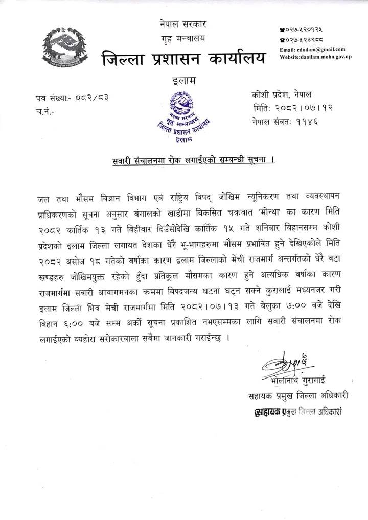 गत २०८२ असोज १८ गतेको वर्षाका कारण इलाम जिल्लाको मेची राजमार्ग अन्तर्गतको धेरै वटा खण्डहरु जोखिमयुक्त रहेको हुँदा प्रतिकूल मौसमका कारण हुने अत्यधिक वर्षाका कारण राजमार्गमा सवारी आवागमनका क्रममा विपदजन्य घटना घट्न सक्ने कुरालाई मध्यनजर गरी इलाम जिल्ला भित्र मेची राजमार्गमा रात्रीकालिन यातायात सञ्चालनमा रोक लगाइएको हो ।