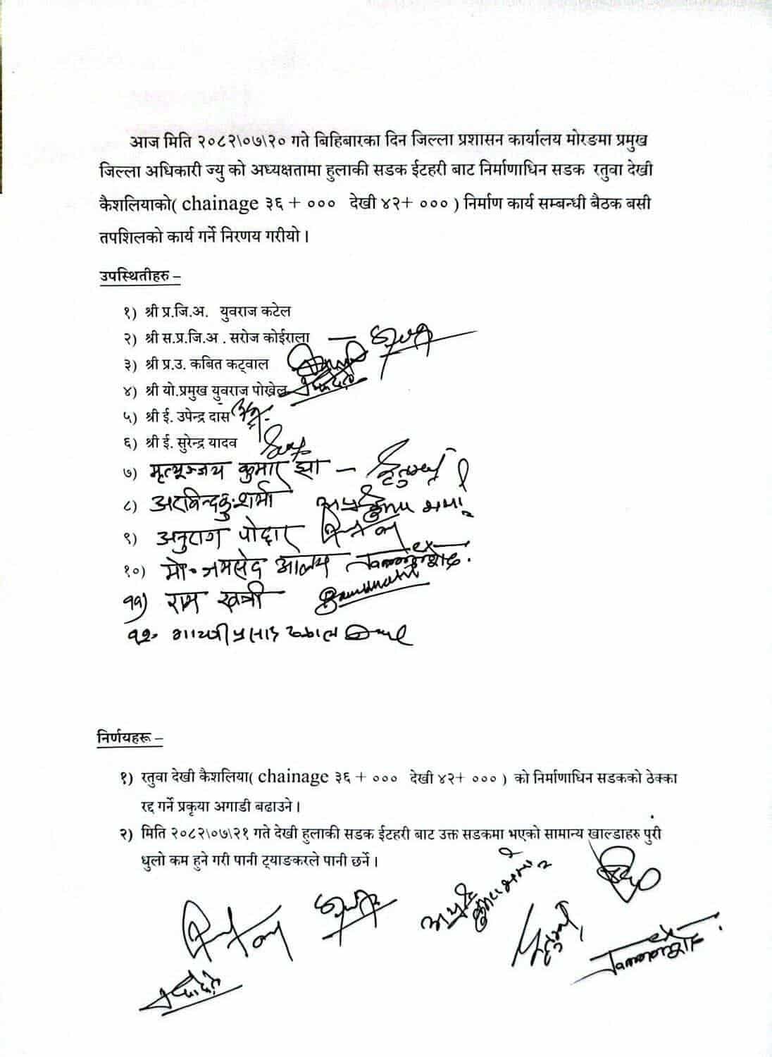 बैठकमा सहायक प्रमुख जिल्ला अधिकारी सरोज कोइराला, मोरङका प्रहरी प्रमुख कबित कटुवाल, हुलाकी सडक इटहरी योजनाका प्रमुख युवराज पोखरेल, इन्जिनियरहरु उपेन्द्र दास र सरेन्द्र यादवसँगै स्थानीयहरु मृत्युन्जय कुमार झा, अरविन्दकुमार शर्मा, अनुराग पोद्दार, मो.जमसेद आलम, राम खत्री र गायत्रीप्रसाद ढकालको उपस्थिति रहेको थियो ।