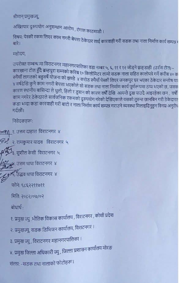 विराटनगर । चार करोड पेश्की लिएर ठेकेदार फरार भएपछि विराटनगर पश्चिमको एउटा सडक छ वर्षदेखि अलपत्र छ । डाक्टर शेखर कोइराला, तत्कालिन विराटनगर महानगरपालिकाका मेयर भीम पराजुली र कोशी प्रदेशसभा सदस्य तथा पूर्व मुख्यमन्त्री केदार कार्कीले महत्व दिएर शिलन्यास गरेको सडक पूर्वाधार, छ वर्षसम्म अलपत्र भएको हो ।