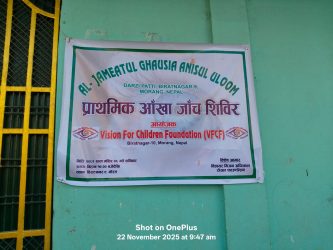 मोरङ — भिजन फर चिल्ड्रेन फाउन्डेसनको पहलमा अल जमियातुल अनिसुल मदरसामा आयोजित नि:शुल्क प्राथमिक आँखा उपचार शिविर सफलतापूर्वक सम्पन्न भएको छ। मदरसामा अध्ययनरत बालबालिकाको दृष्टि स्वास्थ्य अवस्था पहिचान गर्ने उद्देश्यले गरिएको शिविरमा १७ महिना देखि १८ बर्ष सम्मका ३१ बालिका र ४५ बालक गरी ७६ जना बालबालिकाको विस्तृत आँखाको परीक्षण गरिएको आयोजकले जनाएको छ।