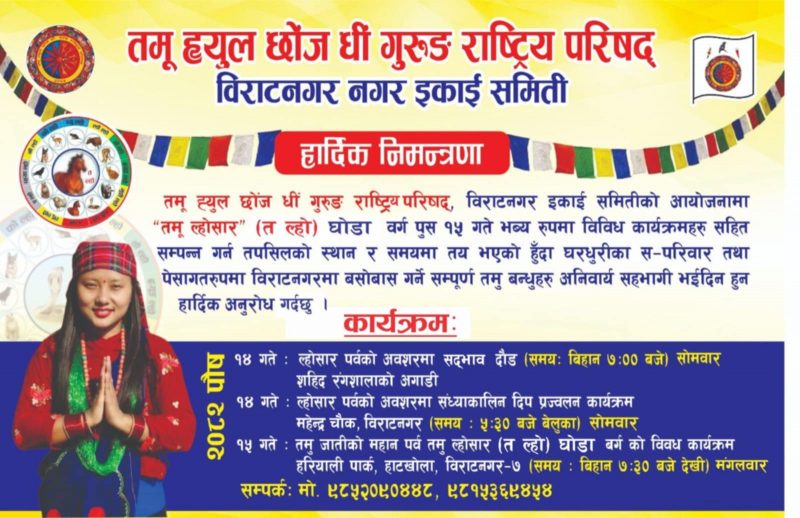विराटनगर । गुरुङ समुदायको महान् पर्व ‘तमु ल्होसार’ आज देशभर हर्षोल्लासका साथ मनाइँदैछ । पुरानो वर्षलाई बिदाइ र नयाँ वर्षलाई स्वागत गर्दै गुरुङ समुदायले आफ्नो मौलिक पर्वलाई भव्यताका साथ मनाउन लागेका हुन् ।